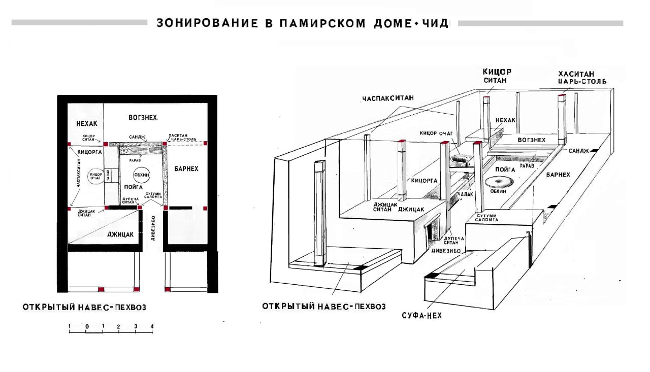 Исследователи образно сравнивают памирский дом с Ноевым ковчегом, в котором собрано все самое необходимое для проживания. Широкие, разновысотные и разнофункциональные глиняные суфы – «нех» (от 0,5 до 1,5 м) – тянутся вдоль стен, прерываясь только у входа, окаймляя загубленную в центре квадратную площадку «пойга».