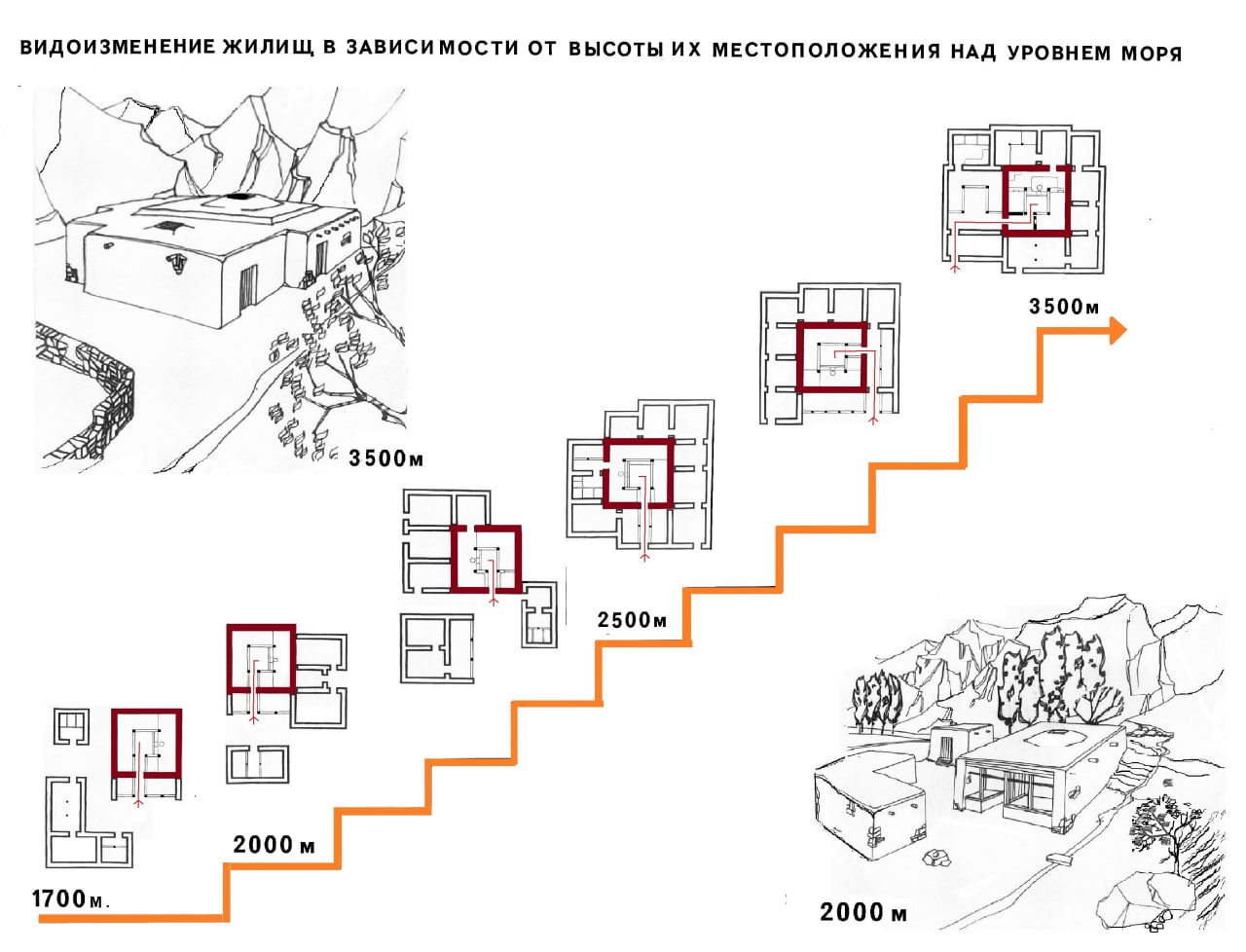 Пластическая градация жилища от открытого, со свободно расположенными строениями в низовье (1700 метров над уровнем моря) до слитных конгломератов в верховьях (3500 м. над уровнем моря), отмечена нами в пределах отдельных долин, протяжённостью не более 100 км, но со значительными перепадами высот – до 1,5 км.