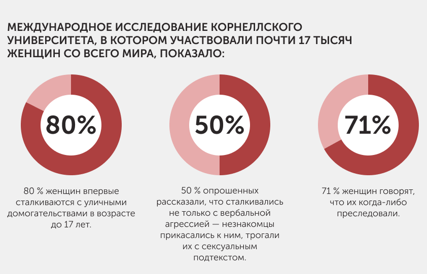 Конечно, в таких условиях распространены и случаи словесного харассмента на улице или работе. И пусть это не сопровождается физическим насилием, выкрики и пошлые комплименты – не менее оскорбительны.
