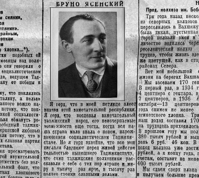 1 августа 1930 года в Таджикистан впервые приехал Бруно Яковлевич Ясенский (1901-1938 гг.) – польский, французский и советский писатель, поэт, драматург, член ЦИК Таджикской ССР.