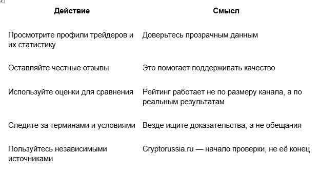 Если вы ищете надёжный ресурс с честными отзывами и рейтингами, обязательно ознакомьтесь с cryptorussia.ru — сайт предоставляет доступ к базе трейдеров, оцененных экспертами платформы на основе реальных сделок и статистики. Это редкий случай, когда статистика действительно влияет на доверие при выборе аналитика или трейдера.