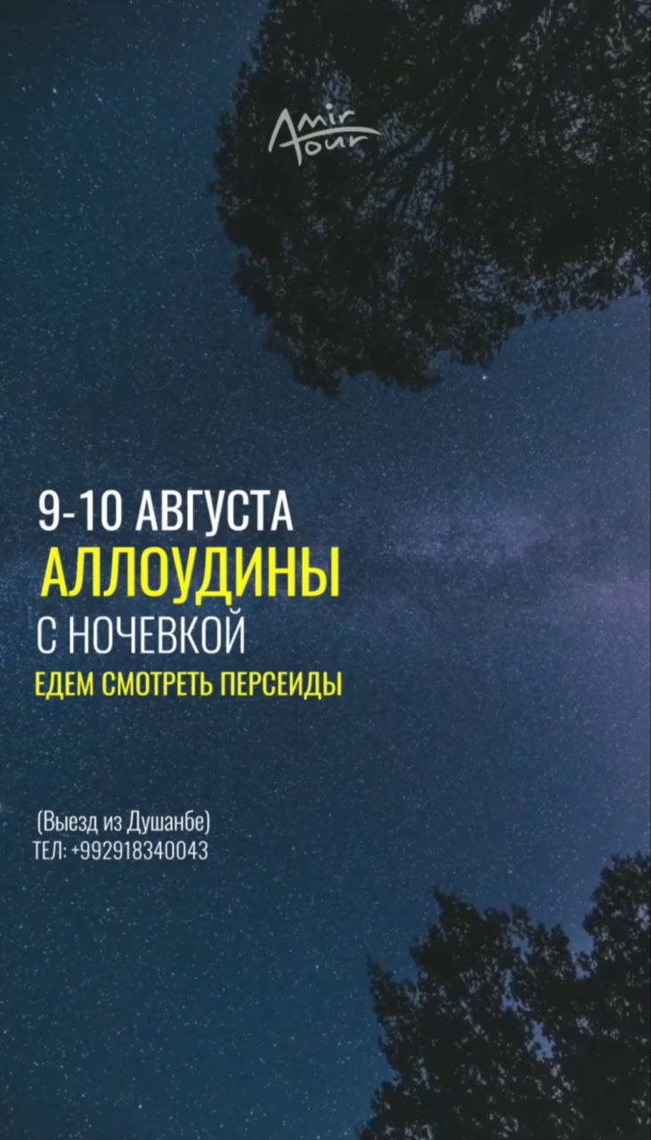 Также Amir Tour предлагает увлекательный двухдневный тур на Аллоудинские озёра 9-10 августа чтобы посмотреть на Персеиды. Поездка сложная, но стоит того, так это одни из самых прекрасных горных озёр в Таджикистане! Персеиды – пик звездопада, выпадающий на 8-13 августа. Такой поток бывает раз в году, поэтому важно не упустить возможность насладиться этим уникальным зрелищем.