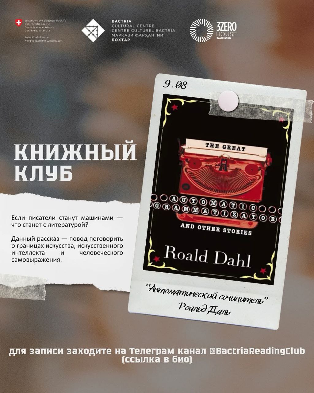 В Культурном центре «Бактрия» в пространстве 3ZERO House Tajikistan (Хонаи Сабз) 9 августа в 16:00 пройдёт очередная встреча «Читательского клуба». На этот раз состоится обсуждение рассказа Роальда Даля «Автоматический Сочинитель» — историю о том, что случается, когда машины начинают писать лучше людей.