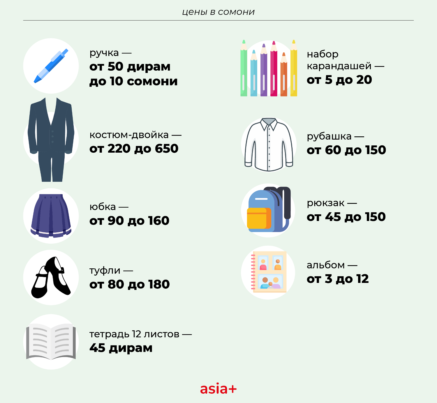 В этом году рубашки здесь стоят от 70 до 100 сомони, а костюмы-двойки и тройки для мальчиков и девочек – 350-450 сомони.
