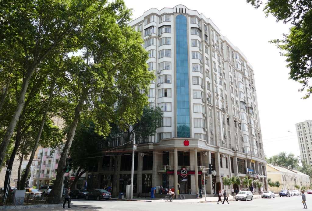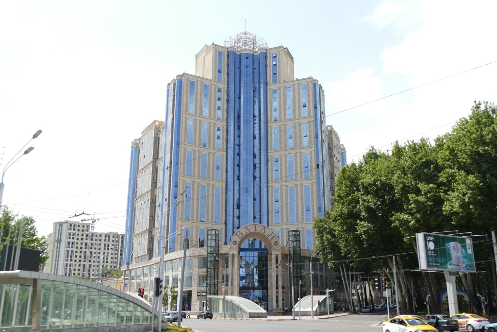 Административное здание на ул. М. Турсунзаде, 2018 год, и жилой комплекс на месте снесенного дома на ул. М. Турсунзаде в 2021 году.