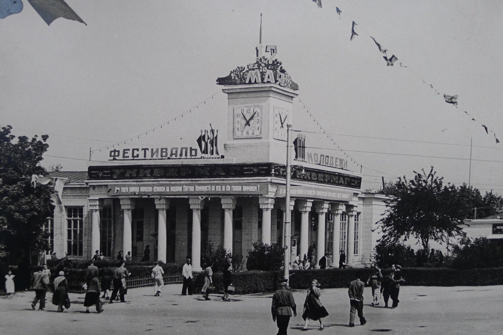 «Люкс» – универмаг №1, Сталинабад, 1958 год и тут же жилой дом с пятиэтажным ризалитом с размещенными магазинами и ателье мод.