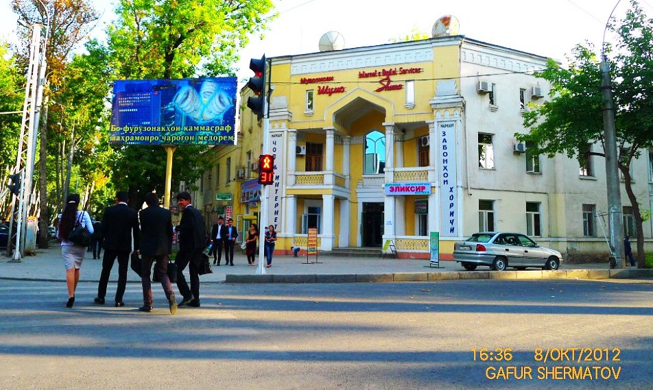 Перекресток на пересечении ул. А. Дониш и С. Айни, 2012 год. Перекресток на пересечении ул. А. Дониш и С. Айни, 2021 год.