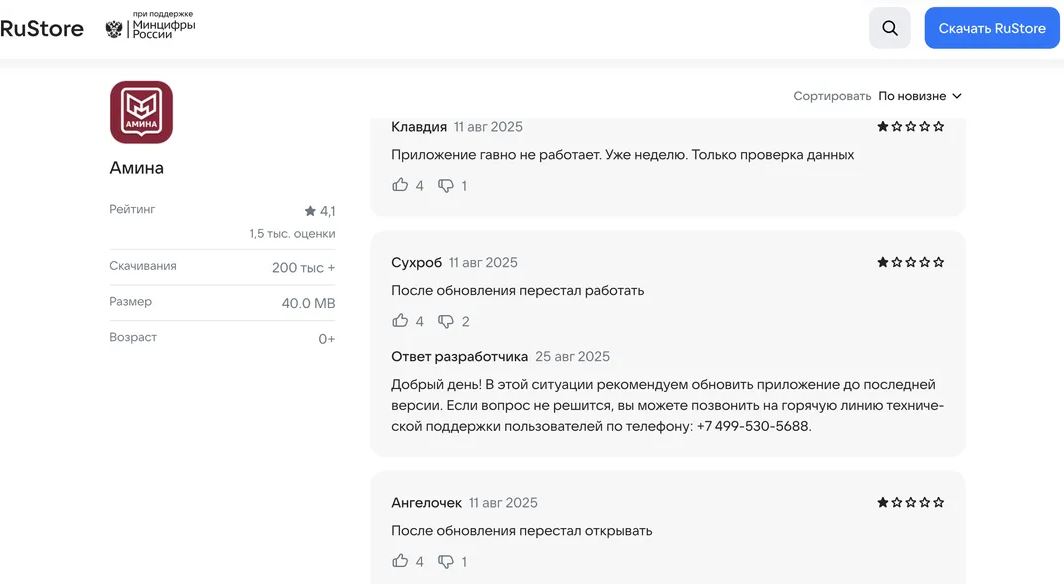 Многие пользователи RuStore жалуются, что пользоваться приложением «Амина» невозможно. Их отзывы изучили «Важные истории». Чаще всего люди отмечают, что сервис вовсе не запускается и требует установить обновление, однако где взять ссылку – непонятно. В ответ им предлагают обращаться в службу поддержки.