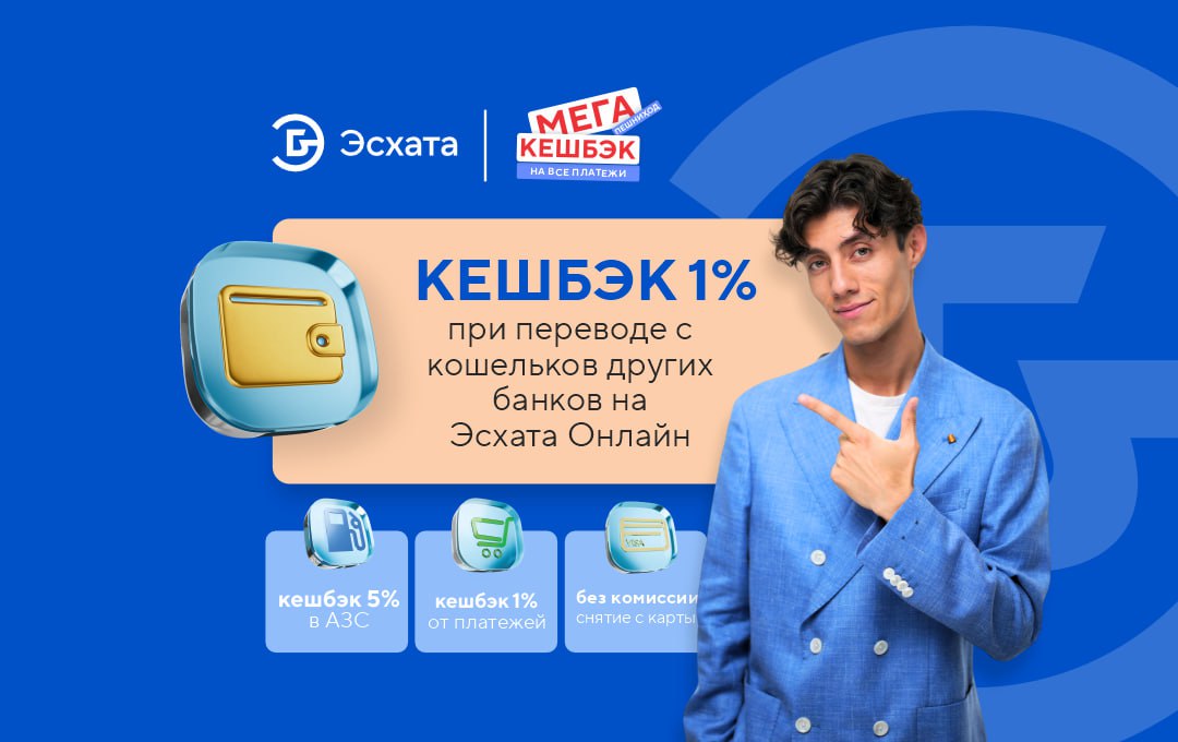 «Эсхата Банк» в рамках «МЕГА пешниход» с 1 сентября запустил дополнительный кэшбек за пополнение кошелька из других банков. Принимайте переводы на свой кошелек в банке «Эсхата» и получайте кэшбек 1%