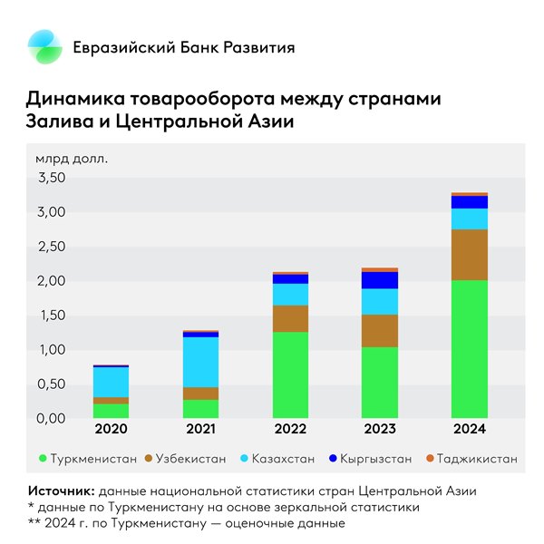 Объем взаимной торговли товарами между странами Персидского залива и Центральной Азии в 2024 году достиг $3,3 млрд, увеличившись более чем в четыре раза по сравнению с 2020 годом, сообщает Евразийский банк развития.