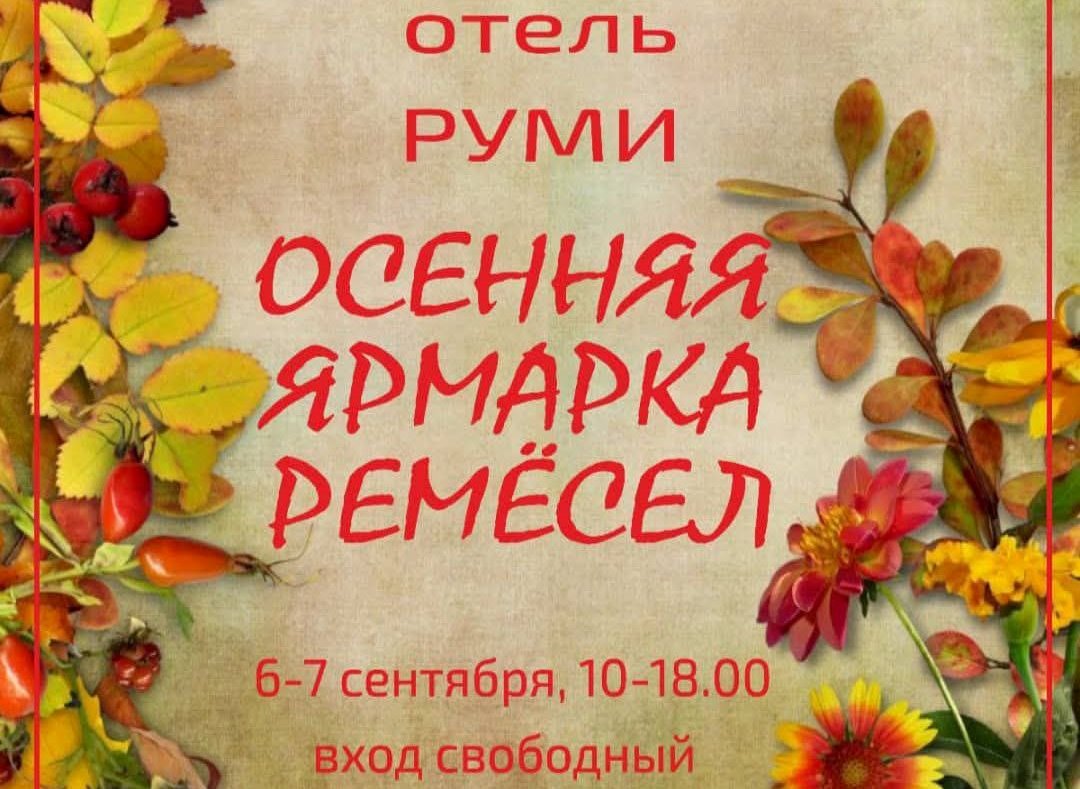 — В отеле «Руми» с 10:00 до 18:00 пройдёт традиционная осенняя ярмарка ремесленников. Посетителям будет представлен огромный ассортимент продукции от лучших ремесленников Таджикистана и мастеров из Узбекистана. Здесь вы найдёте: изделия из керамики, дерева, национальных тканей, пряжи; одежду и аксессуары с национальной вышивкой; ювелирные изделия ручной работы; бижутерию из натуральных материалов (дерево, кожа, металл); крафтовое натуральное мыло и косметику; продукцию из кожи и шерсти; фруктовую пастилу, фруктовые чипсы, пряники, шоколад и многое другое. Вход свободный.
