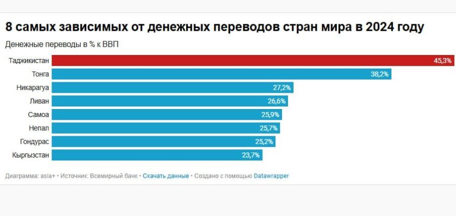 Между тем, по оценкам международных финансовых институтов, экономика Таджикистана входит в число наиболее зависимых от денежных переводов в мире. В последнем докладе МОМ со ссылкой на данные ВБ говорится, что приток денежных переводов в Таджикистан в 2024 году составил $5,8 млрд, что на 27% больше по сравнению с 2023 годом.