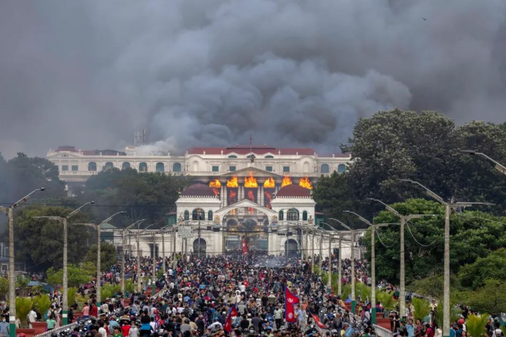В Катманду десятки тысяч человек собрались у здания парламента и попытались прорваться внутрь. Они подожгли здания парламента, Высшего суда, дворец правительства, который полностью выгорел. Дворец Сингха Дурбар, в котором располагалось правительство, был построен в 1908 году.