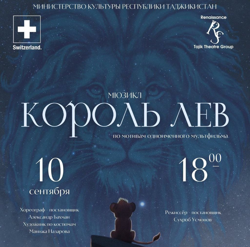 — На сцене Государственного академического театра им. С. Айни в 18:00 состоится показ детского мюзикла «Король Лев» от театральной группы «Ренессанс» Сухроба Усманова. Это легендарная история о львёнке Симбе, который пережил смерть отца, предательство, изгнание и лишения, но нашел верных друзей и сумел отомстить, вернув себе законный трон. Приходите и погрузитесь в увлекательный мир саванны. Стоимость билета: 50 сомони. Билеты доступны на сайте echipta.tj.