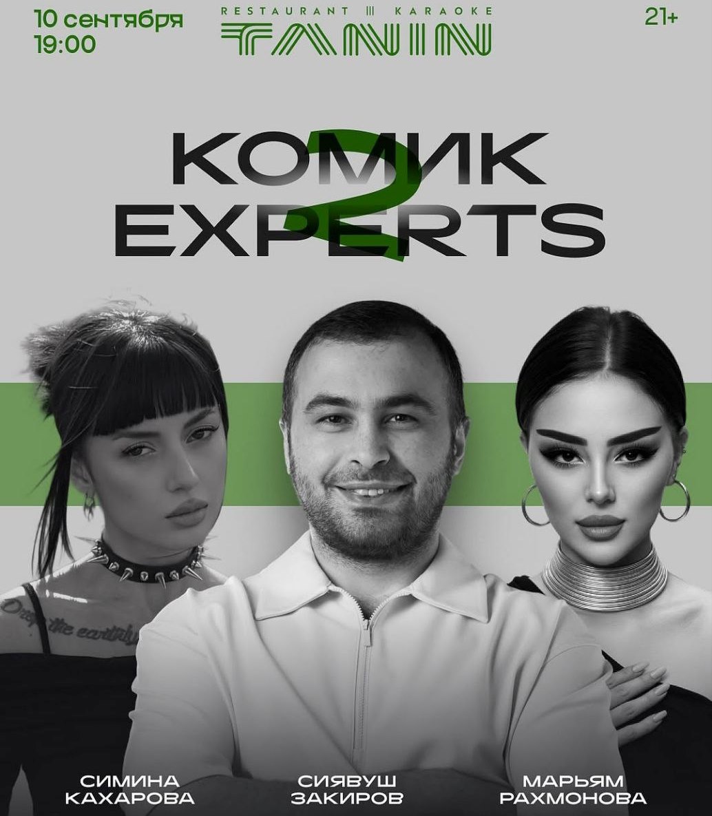 — В ресторане-караоке «Танин» в 19:00 состоится показ нового импровизационного, интерактивного шоу, где зрители будут делиться своими проблемами, а комик и эксперты дадут советы как их решить. Это будет живое шоу, где нет сценария, но есть реальный разговор. Вас ждёт полная импровизация, честность и юмор. В роли экспертов: Кахарова Симина – один из самых востребованных графических дизайнеров страны; fashion influencer, визуальный контакт с которой превращается в флешбеки; Марьям Рахмонова – столичная топ-модель. А в роли комика – организатор шоу Сиявуш Зокиров. Билеты можно приобрести на входе.
