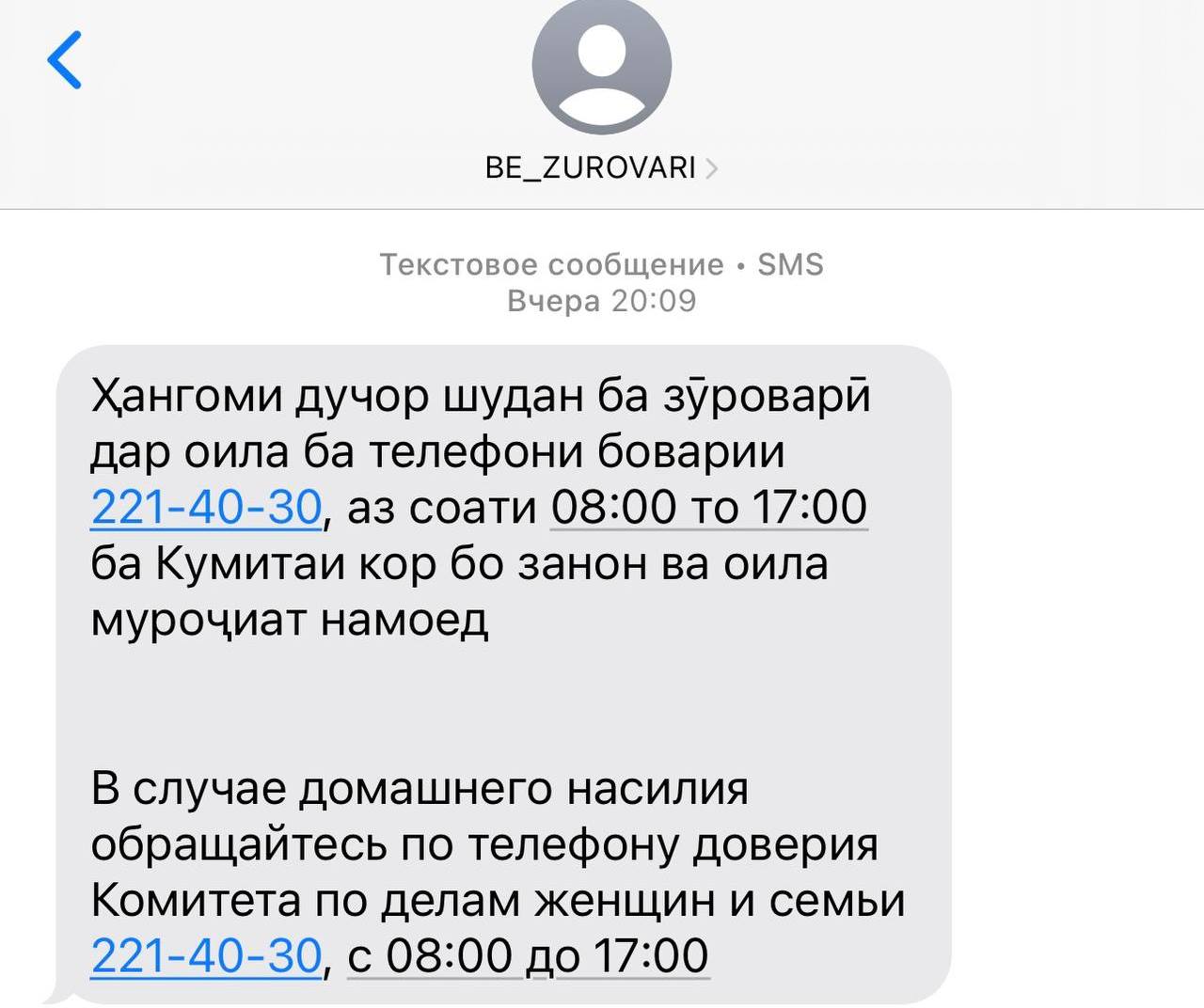 В сообщениях говорилось, что каждый, кто столкнулся с домашним насилием, может позвонить по номеру +992 (37)221-40-30 и получить помощь. Контактный центр принимает звонки с понедельника по пятницу с 8:00 до 17:00, а по субботам – с 8:00 до 12:00.