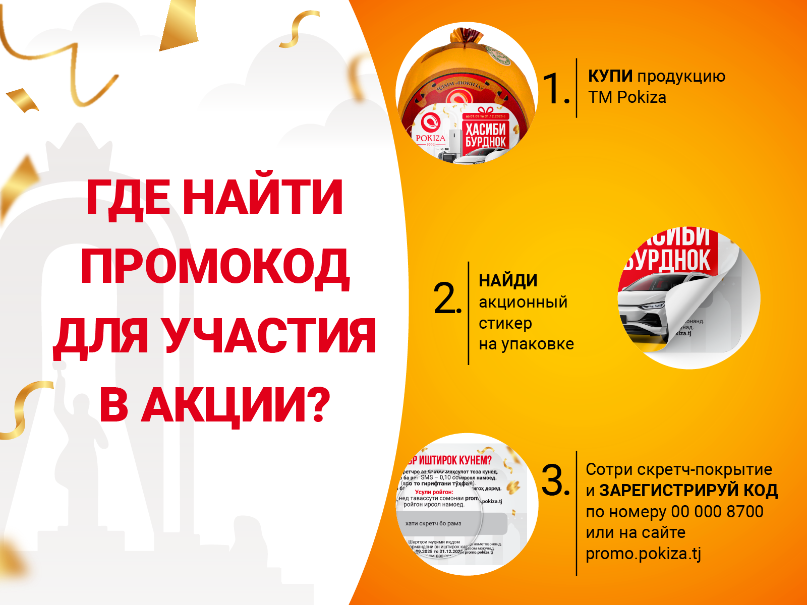 Регистрируйте код на сайте promo.pokiza.tj или по SMS на номер 00 000 8700
