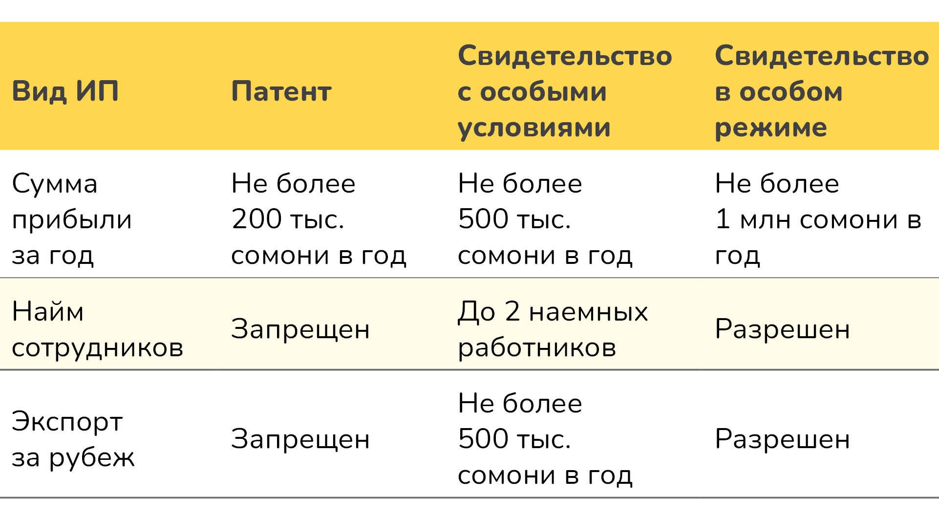 До апреля 2024 года в Таджикистане существовали два вида индивидуальной предпринимательской деятельности – на основании патента и на основании свидетельства.