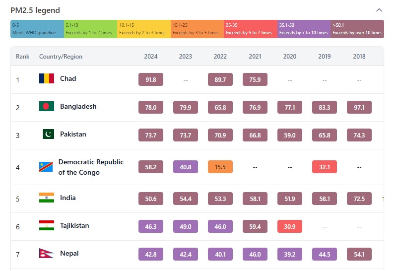 Здесь для сравнения приводятся показатели стран с 2018 по 2024 год. Рейтинг самых загрязнённых стран и регионов основан на среднем ежегодном уровне концентрации PM2.5 (мкг/м³). В списке приведены 138 стран.