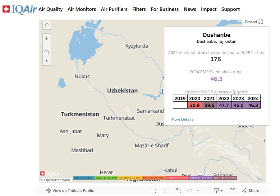 Касательно именно загрязненности городов, Душанбе оказался на 176 месте со среднегодовой концентрацией PM2.5 в воздухе равной 46.3 в 2024 году. Всего в списке представлено 8 тыс. 954 города.