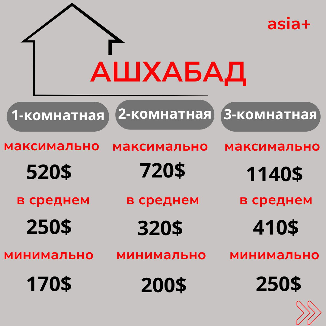 Среди столиц стран Центральной Азии аренда жилья относительно дешевле в Ашхабаде. Здесь в среднем за 250 долларов можно снять однокомнатную квартиру площадью 40 кв. м, оборудованную необходимой мебелью и техникой. Аренда двухкомнатной квартиры обойдётся в среднем в 320 долларов, трёхкомнатной — в 410.