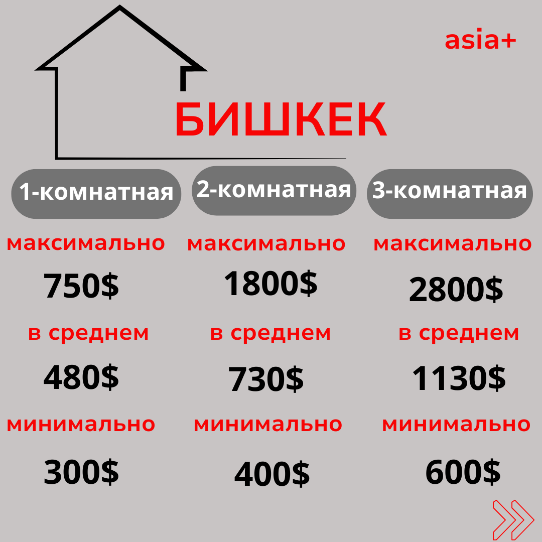 В Бишкеке стоимость аренды жилья также примерно сопоставима с ташкентскими ценами. Средняя ставка за однокомнатную квартиру здесь составляет 480 долларов, за двухкомнатную — 730, за трёхкомнатную — 1130, в зависимости от площади и условий проживания.