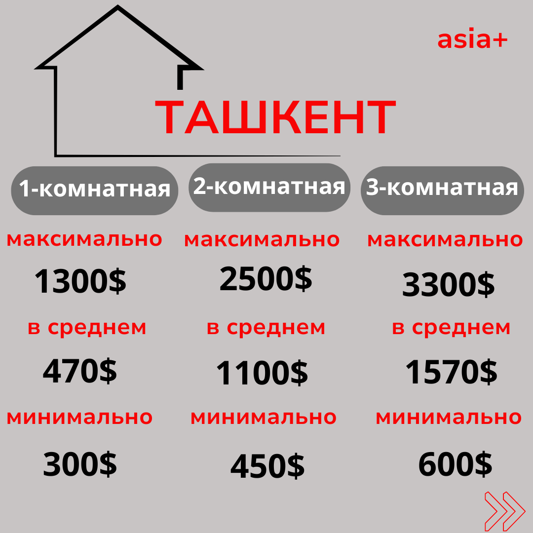 Наиболее высокие цены — в Астане и Ташкенте. В этих городах аренда однокомнатной квартиры в среднем составляет от 470 до 920 долларов, двухкомнатной — от 1100 до 1400, а трёхкомнатной — от 1570 до 1960 долларов.