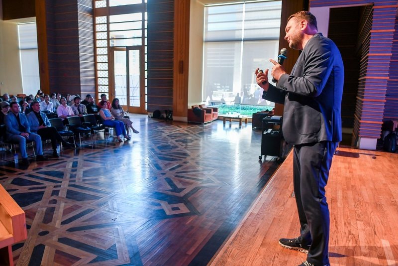 Он предложил аудитории мысленно стать наполовину Стивом Джобсом и наполовину Аристотелем — сочетание прагматизма и философского осмысления помогает понять, как бренд создает капитал, который измеряется не деньгами и зданиями, а доверием и репутацией.