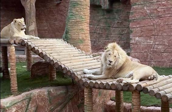 Один самец делит две совмещенные клетки с тремя львицами, другая пара находится отдельно.
