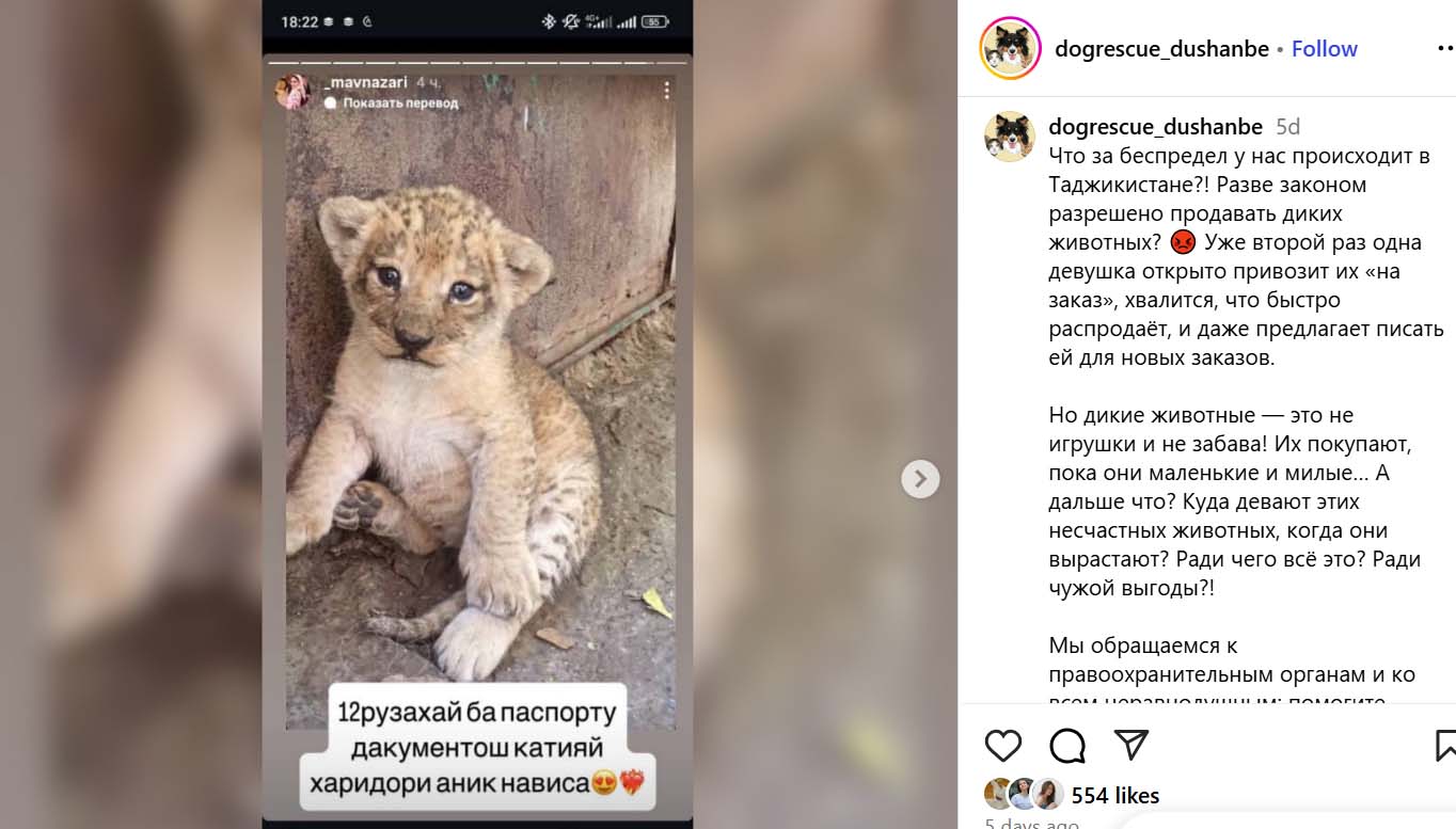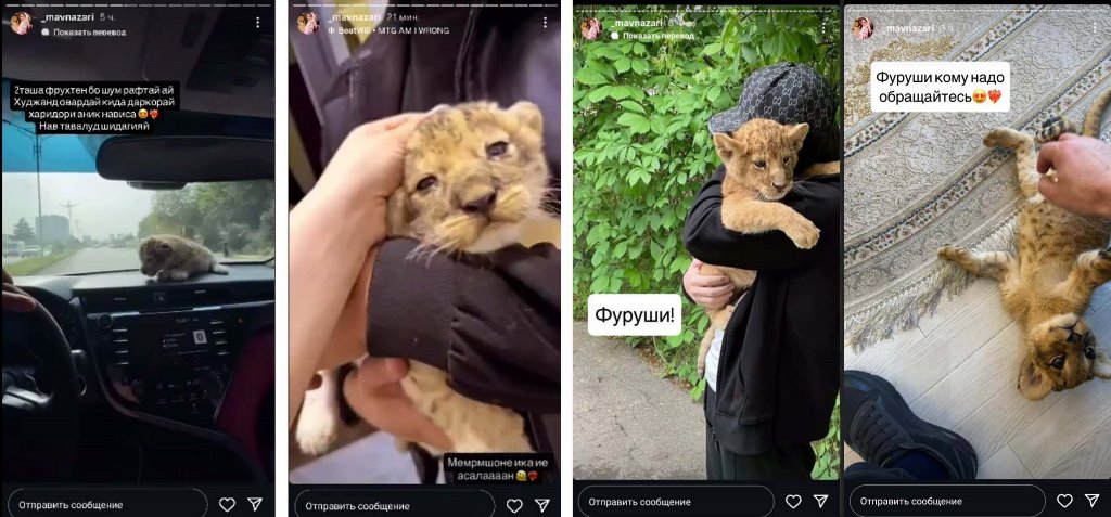 На днях в таджикском сегменте соцсетей появилось объявление о продаже львят. Пользовательница Instagram открыто рекламирует новорожденных на своей странице, делится «успешными» продажами и демонстрирует «уютную жизнь» львят — как их гладят, возят в машине и держат на руках, словно плюшевых игрушек.