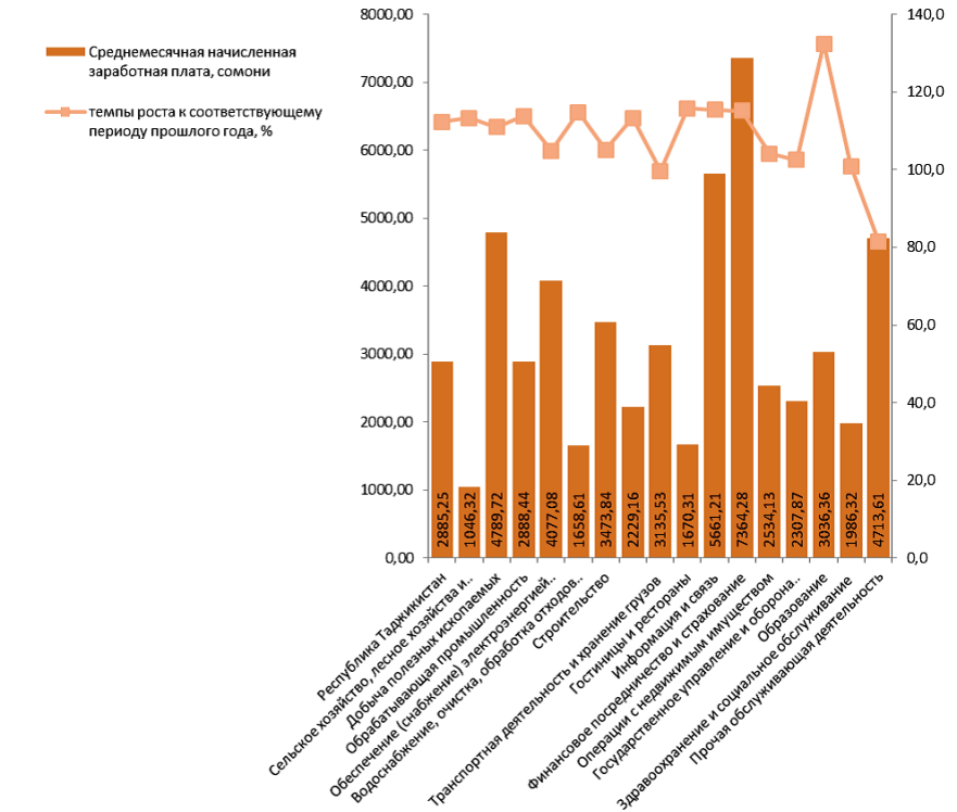 В Согдийской области средняя зарплата составила 2599 сомони ($273), в РРП – 2341 сомони ($246), в ГБАО – 2286 сомони ($241), Хатлонской области – 2236 сомони ($235).