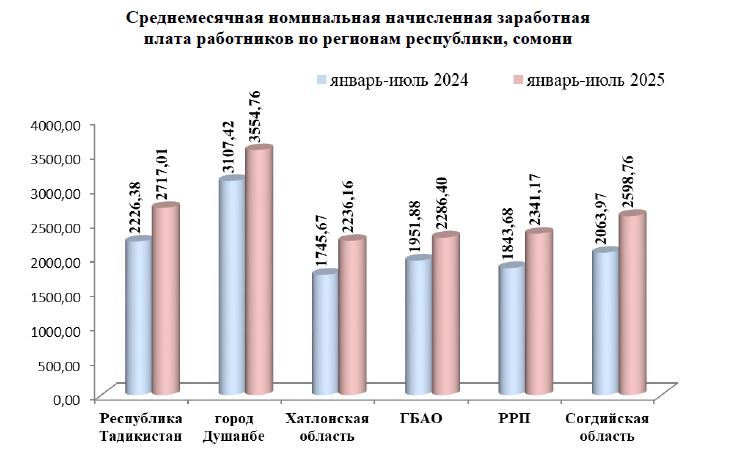 Среднемесячная номинальная зарплата в столице страны в январе-июле текущего года составила около 3555 сомони ($374), что на 14,4% больше по сравнению с этим же периодом 2024 года.