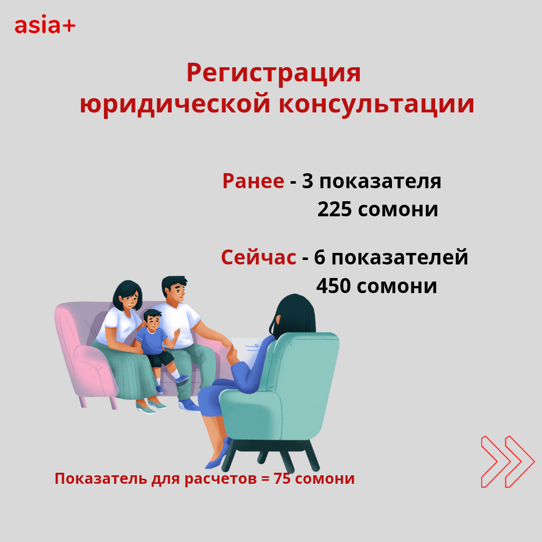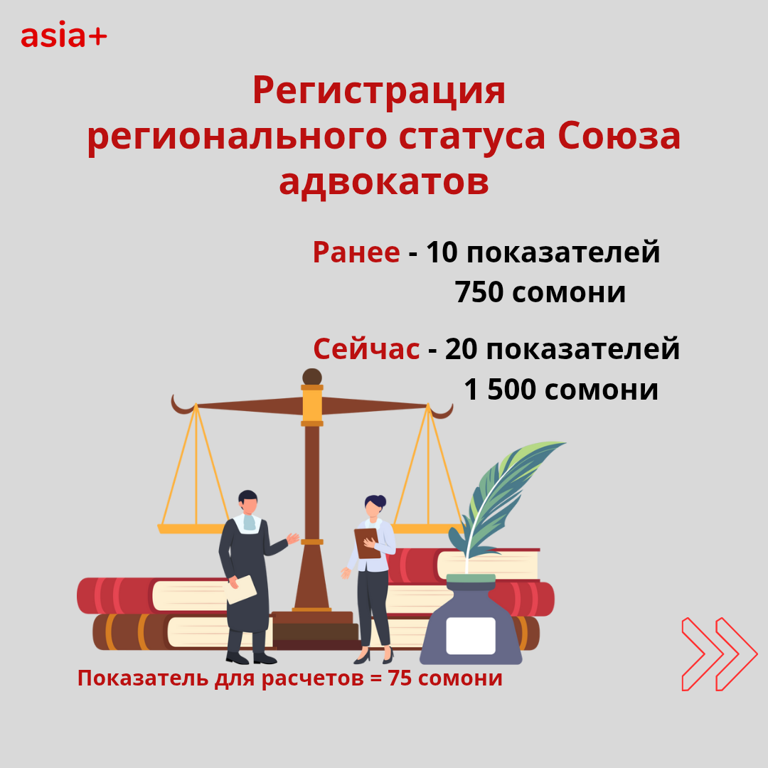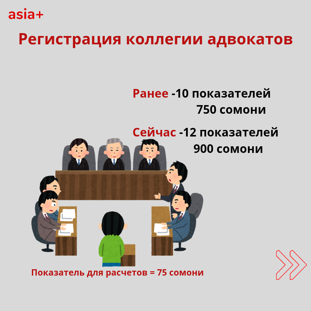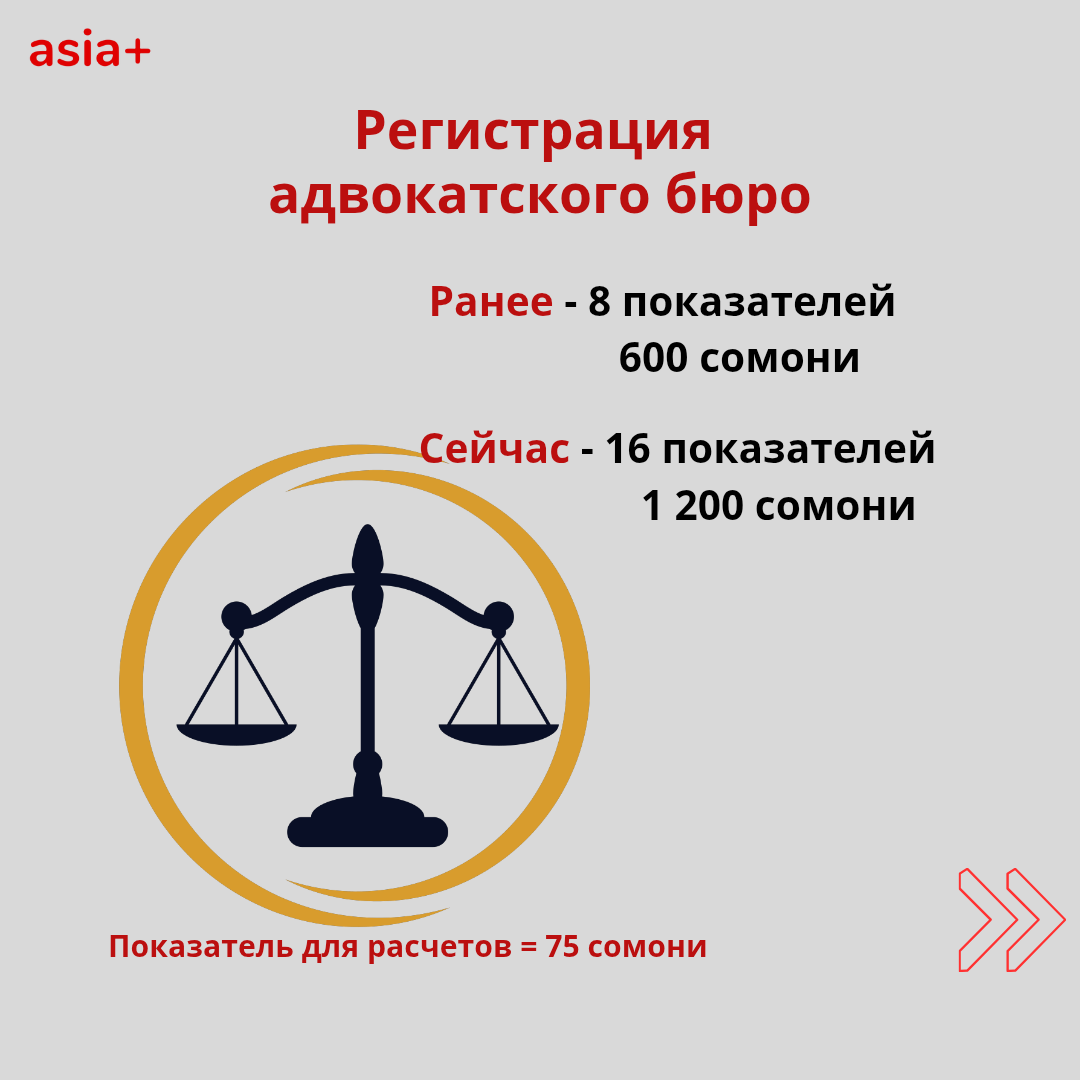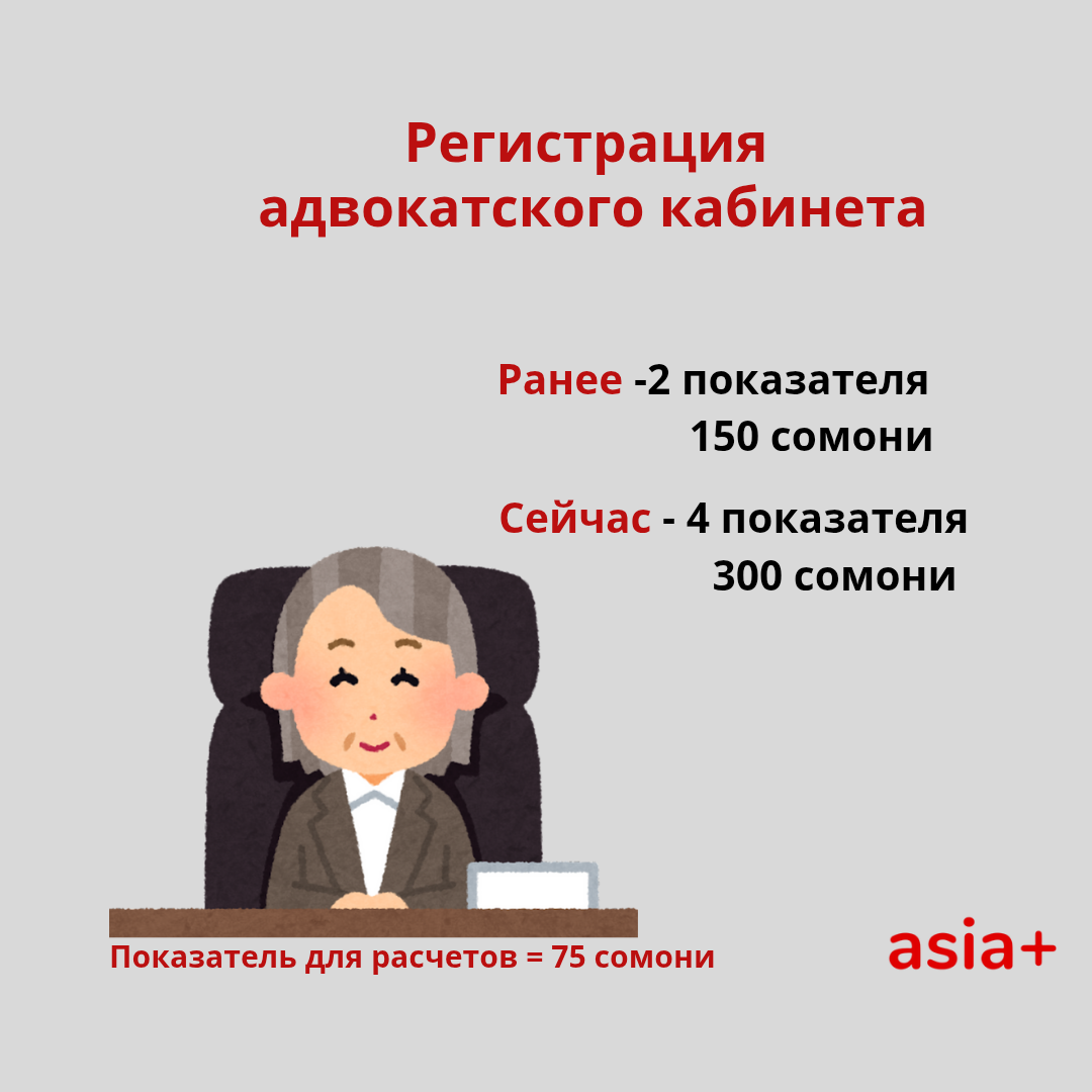 Подорожала и регистрация адвокатских структур. Так, создание Союза адвокатов теперь стоит 2 250 сомони вместо прежних 1 125, а открытие адвокатского бюро — 1 200 сомони вместо 600.