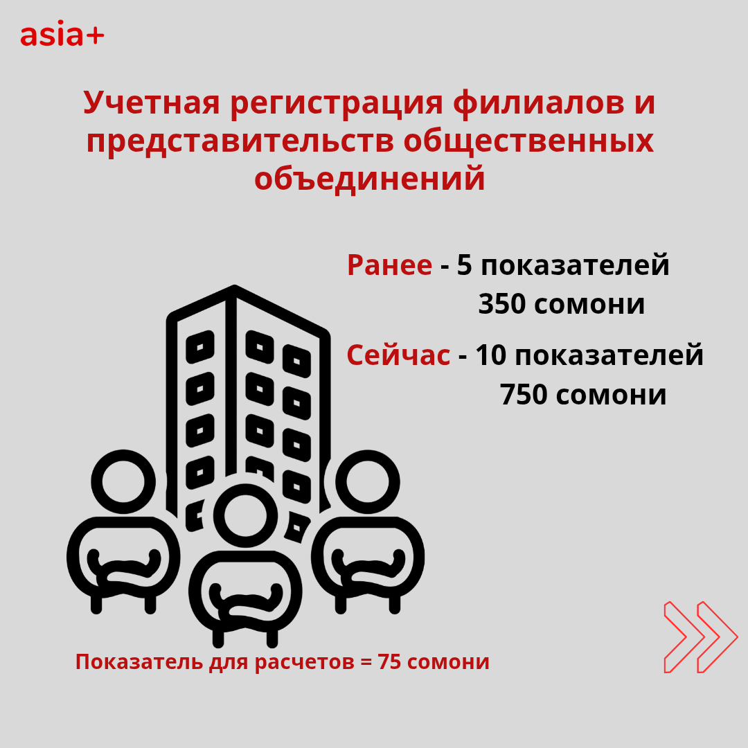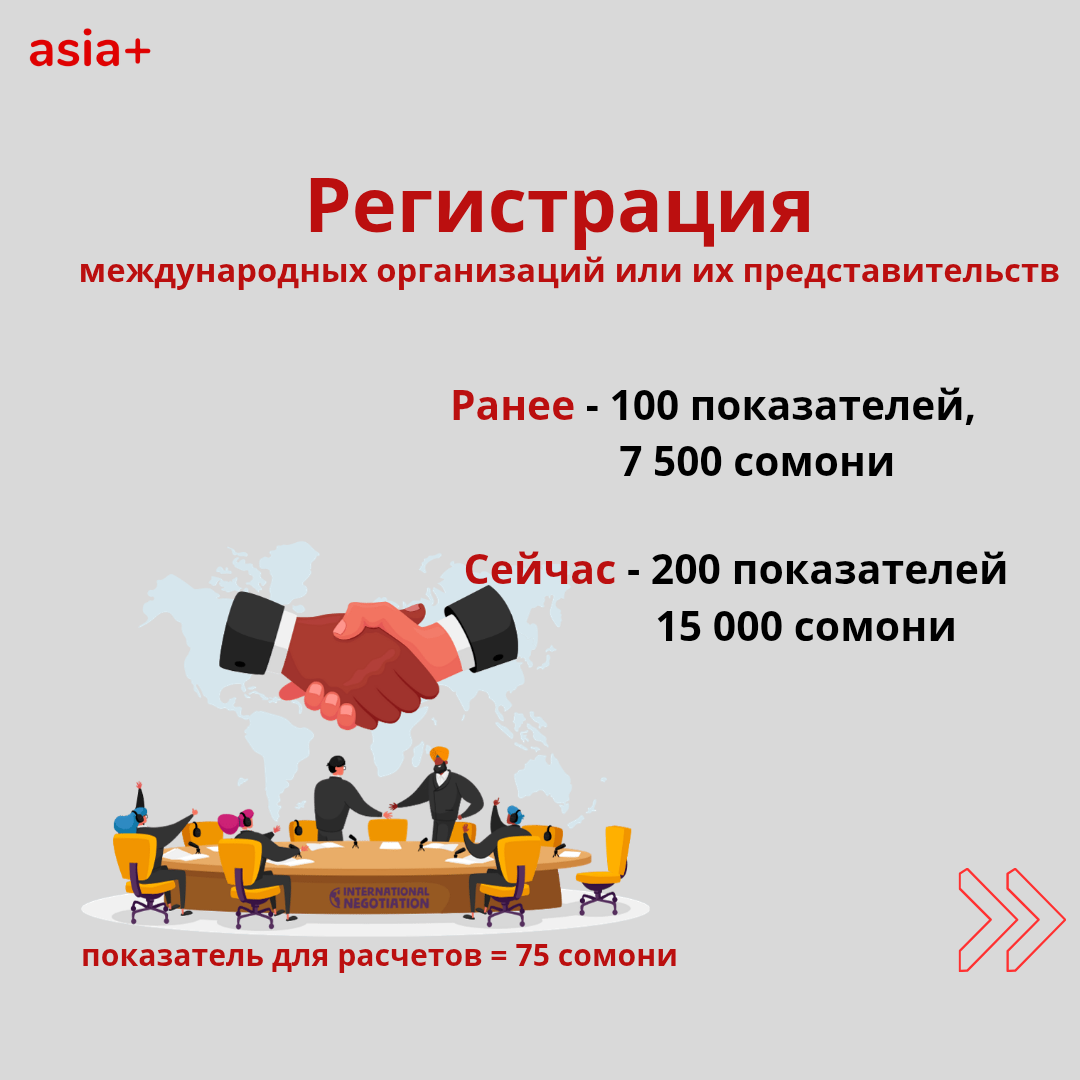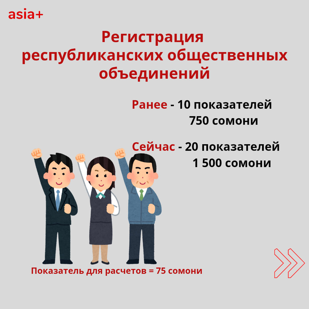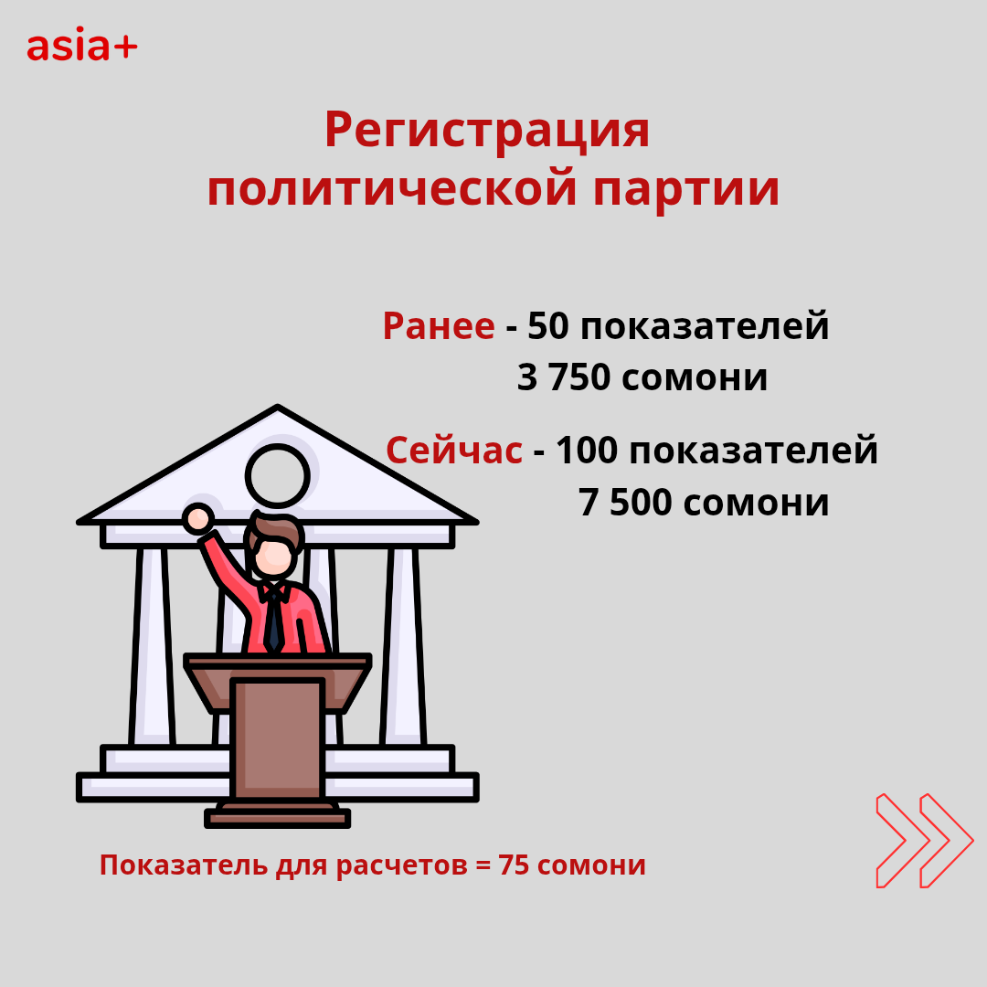 Согласно документу, пошлина за регистрацию политической партии увеличена с 3 750 до 7 500 сомони, за регистрацию международной организации — с 7 500 до 15 000 сомони, а общественной организации — с 750 до 1 500 сомони.