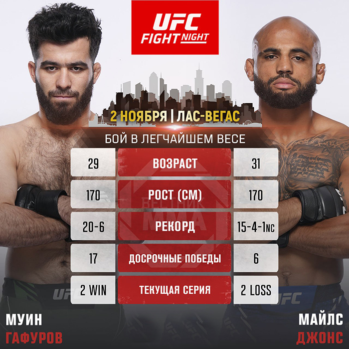 В Лас-Вегасе 2 ноября на турнире UFC Vegas 110 состоится бой, который привлекает особое внимание фанатов смешанных единоборств в Центральной Азии. Муин Гафуров из Таджикистана (20-6, UFC 2-2) сойдётся в октагоне с опытным американцем Майлсом «Чапо» Джонсом (15-4-1NC, UFC 6-4-1NC). «АП» разбирает будущий поединок.