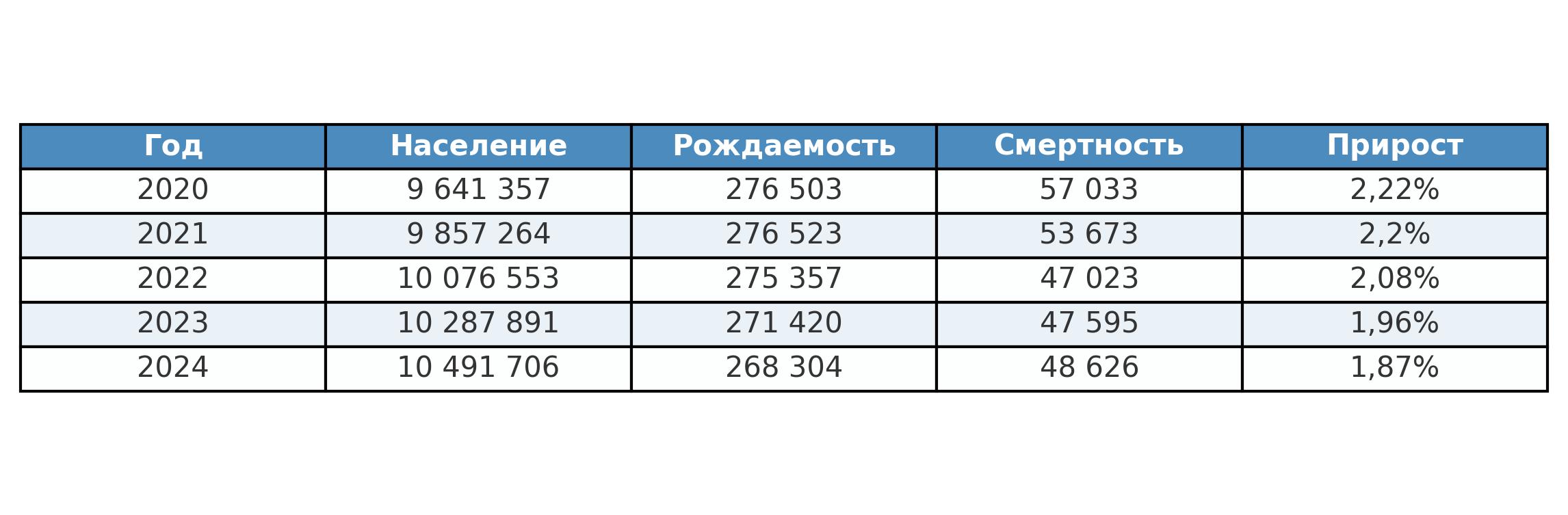 Несмотря на это, Таджикистан остается среди стран мира с самыми высокими темпами роста численности населения (среднегодовой прирост за 2020-2024 гг. составил 2%). Для справки: средний прирост населения в мире за этот период составил 0,9% (более чем в два раза ниже, чем в Таджикистана), а численность населения России за эти годы, наоборот, сократилась (среднегодовое снижение – 2,8%).