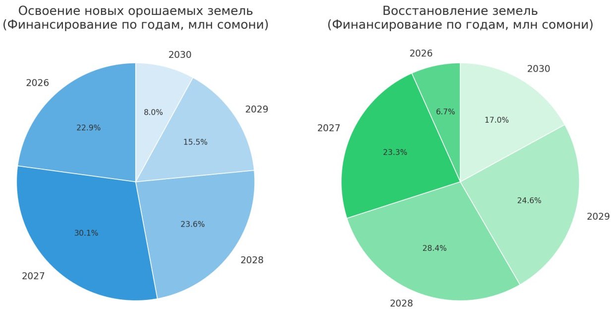 Программа реализуется по двум направлениям: освоение новых орошаемых земель площадью 11,8 тыс. гектаров с общим бюджетом 492 млн сомони, а также восстановление ранее выбывших земель площадью 16,75 тыс. гектаров, на что предусмотрено 335 млн сомони. Работы будут проводиться поэтапно в течение пяти лет.