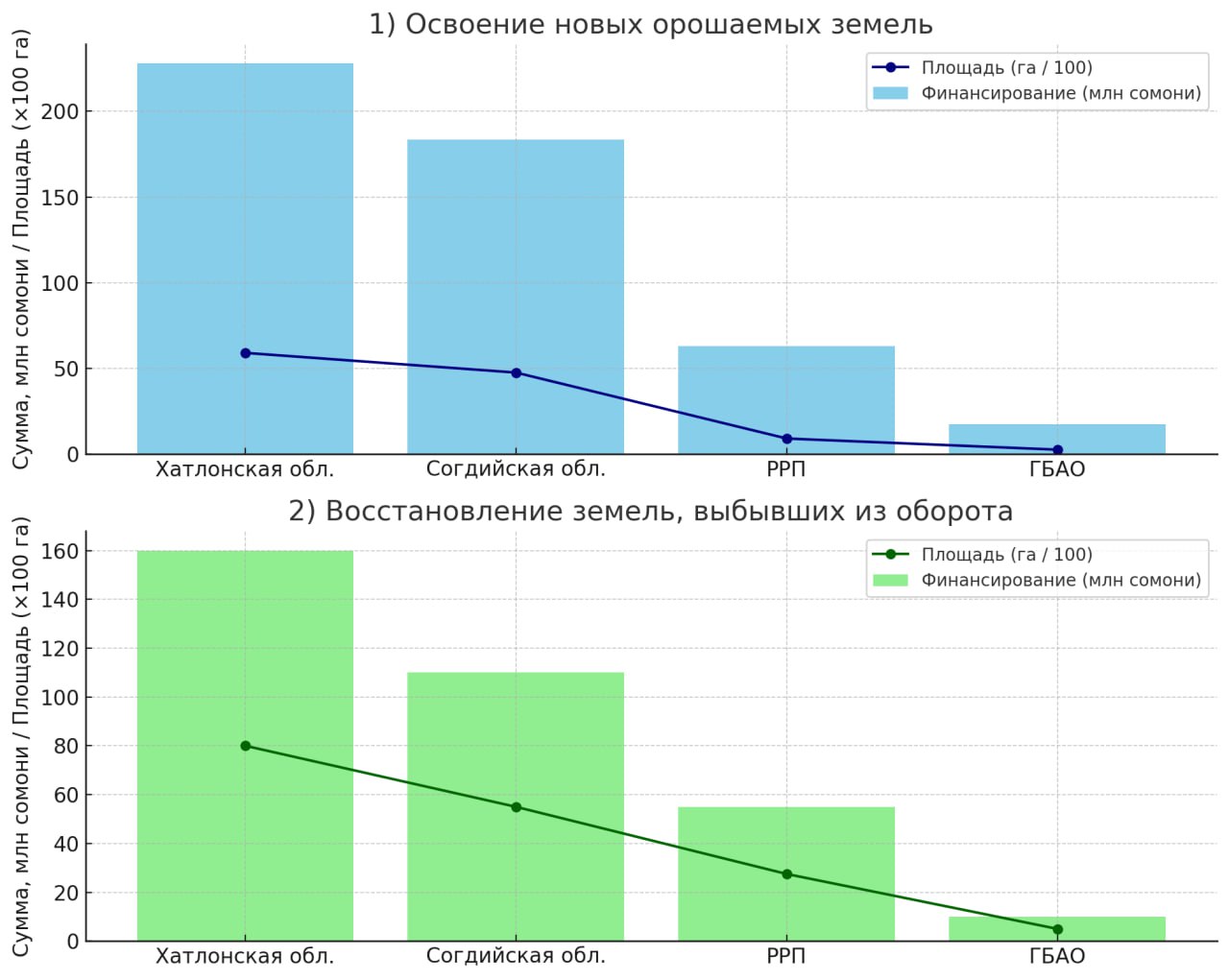 Наибольший объём работ запланирован в Хатлонской области — освоение 5,9 тысячи гектаров новых земель на сумму 228 миллионов сомони. Проекты реализуются в районах Джайхун, Вахш, Фархор и Дангара, где крупнейший участок (2,4 тыс. га) будет освоен за счет инвестиций.
