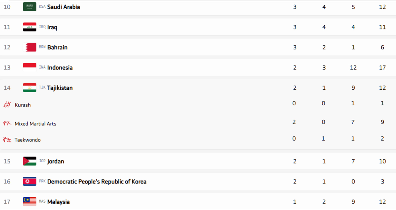 После очередных успешных дней таджикская команда поднялась на 14-е место в общем медальном зачёте, обогнав Иорданию и Бахрейн.