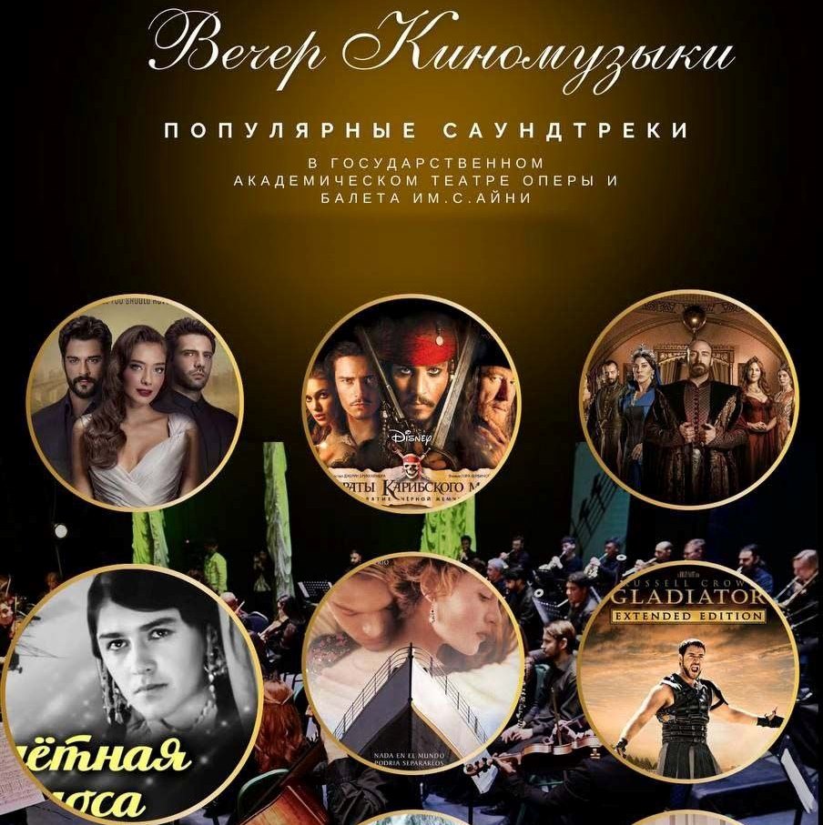 — В Государственном академическом театре оперы и балета им. С. Айни в 18:30 состоится вечер киномузыки, где прозвучат саундтреки к культовым голливудским и турецким фильмам в исполнении симфонического оркестра театра под управлением дирижеров Далера Тиллоева и Аъзамхона Ахмедова и Академического хора под управлением Елены Тиллоевой.