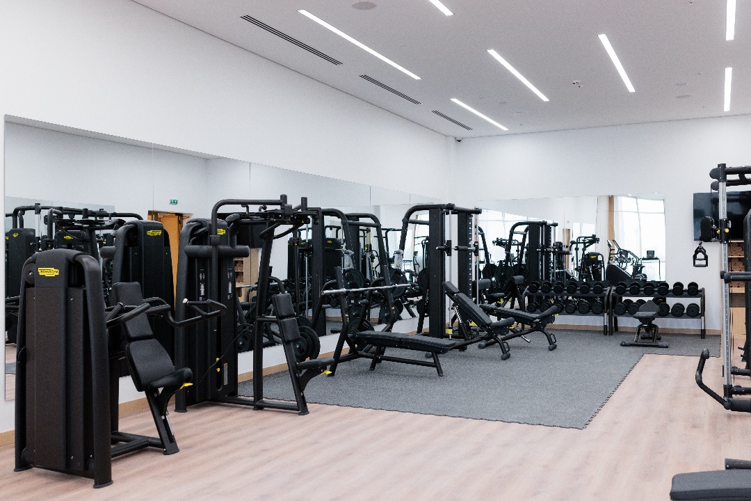 Фитнес-зал оборудован брендом Technogym, есть беговые дорожки, эллипсы и полноценные тренажёры. Панорамные окна открывают вид на город.