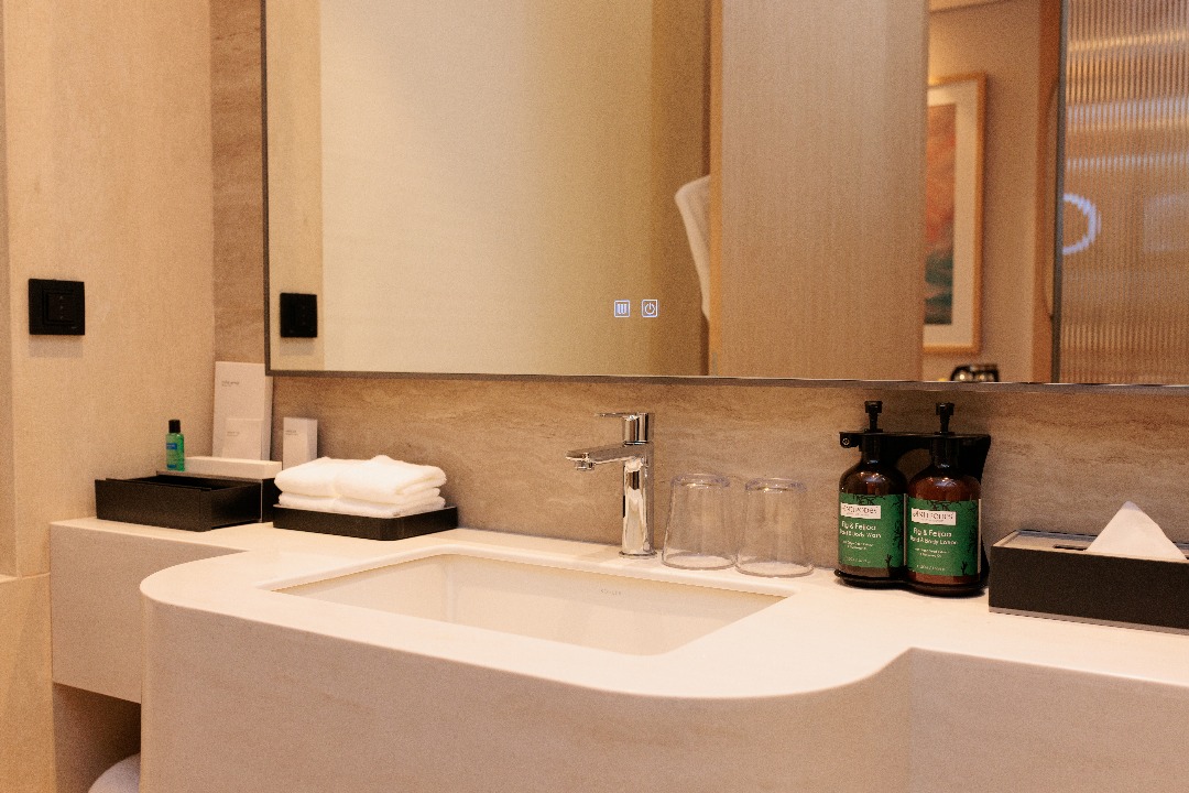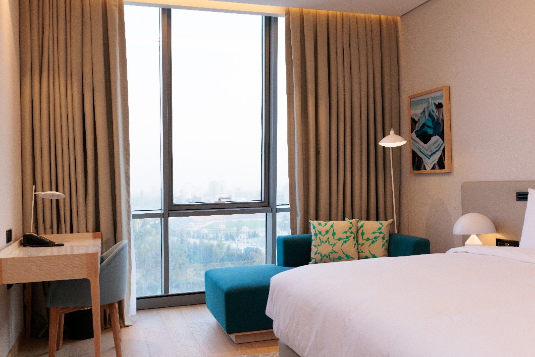 — выезд (check-out) в 11:00). В нём большая кровать, диван, шкаф, сейф, плазменный телевизор, мини-бар и капсульная кофемашина. Ванная комната просторная, с панорамным окном, есть душ и все необходимые косметические принадлежности. Номер оформлен в светлых тонах с национальными акцентами: вышивка на подушках и картины.