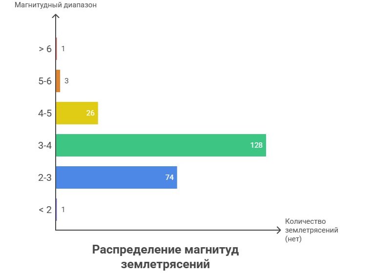 За последние 30 дней в Афганистане произошло 175 землетрясений, среди них одно магнитудой 6 и выше, три от 5 до 6, тридцать девять от 4 до 5, сто пятнадцать от 3 до 4 и семнадцать от 2 до 3 баллов.