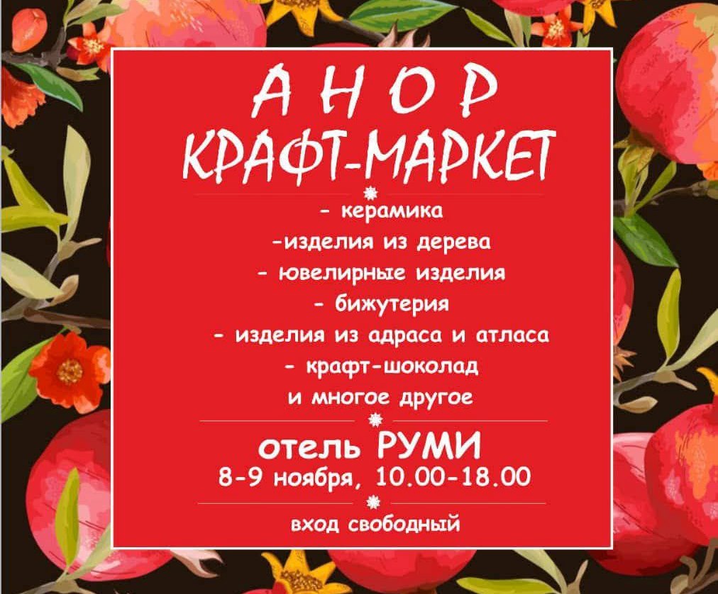 — В отеле «Руми» с 10:00 до 18:00 проходит традиционная ярмарка-продажа ремесленных изделий «Анор крафт-маркет» – самое яркое, сочное и вкусное осеннее мероприятие с участием народных умельцев из Таджикистана, России, Узбекистана и Афганистана. На ярмарке будет представлен большой ассортимент изделий из дерева, керамики, национальных тканей атласа и адраса, ювелирных украшений, бижутерии, а также сладостей ручной работы – шоколада, пастилы, мармелада и многого другого. Вход свободный.