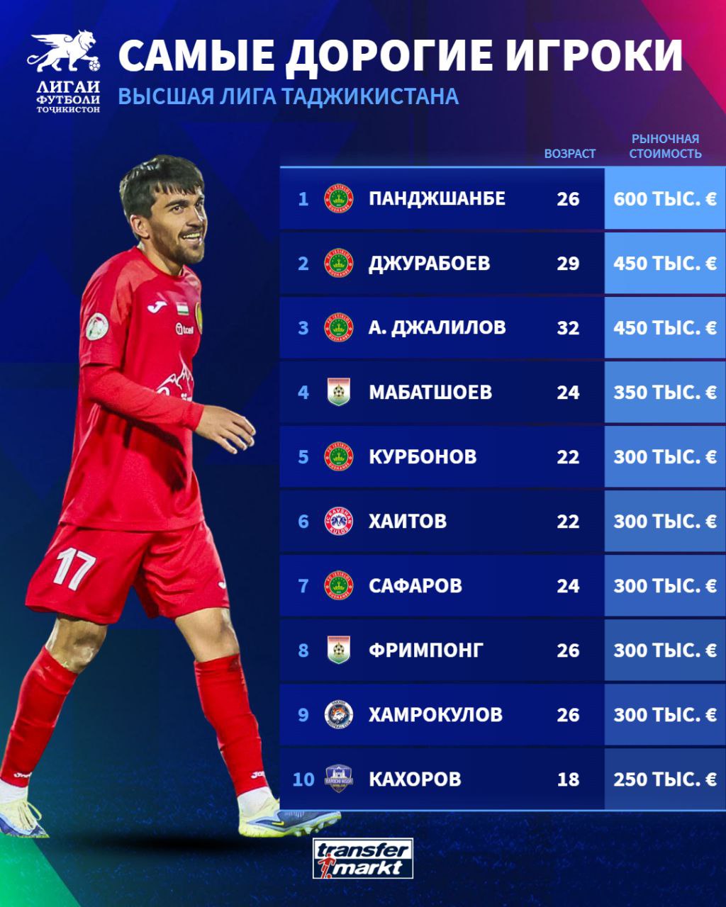 Не остался в стороне и «Вахш» из Бохтара. Форвард Нуриддин Хамрокулов сохранил высокий уровень (300 тысяч евро), а вратарь Адам Ковач из Словакии стал одним из главных скачков обновления — его стоимость выросла на 100 тысяч, до 200 тысяч евро. В той же зоне — камерунец Тони Бикатал и нападающий Сунатулло Исмоилов, подтверждающие, что в «Вахше» формируется сбалансированная и дорогая команда.