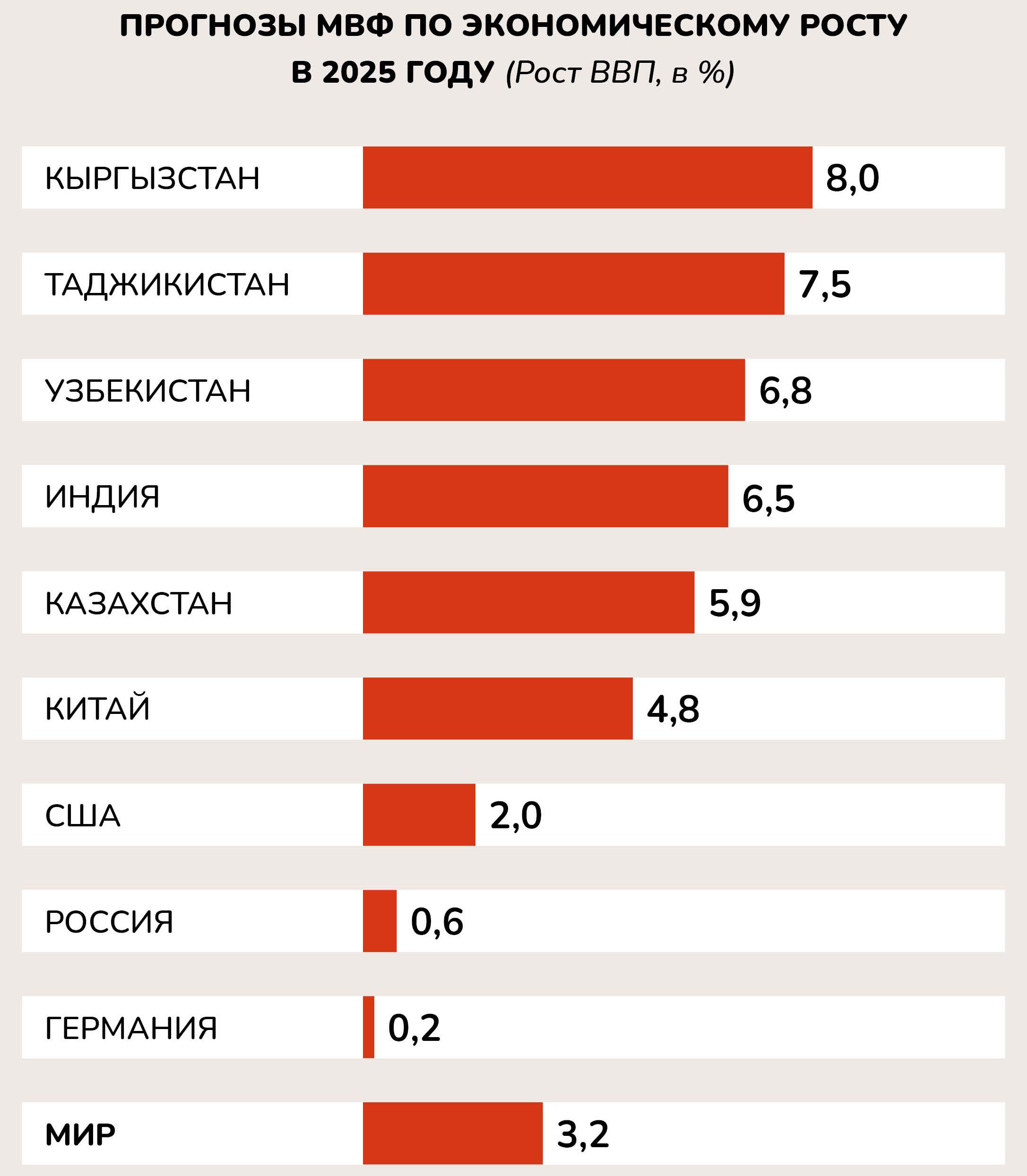 В Центральной Азии наряду с Казахстаном высокие темпы роста будут наблюдаться и в Таджикистане, что подчеркивает тенденцию к более активному развитию региона. Напротив, экономики Европейского Союза, в том числе, Германии прогнозируют существенное замедление роста, что делает регион менее динамичным по сравнению с Азией.