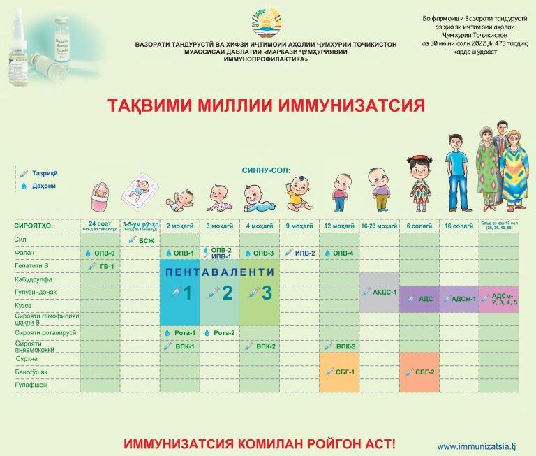 — Согласно национальному календарю профилактических прививок в Республике Таджикистан, утвержденному приказом №475 от 30.06.2022 года «О внесении изменений в приказ МЗ СЗН РТ от 06.02.2020 года, №78 «О совершенствовании системы вакциноконтролируемой профилактики инфекционных заболеваний», предусмотрены следующие прививки для детей: