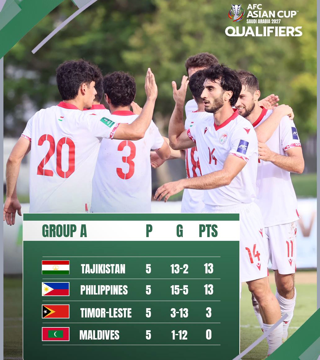 После пятого тура сборная Таджикистана имеет 13 очков и возглавляет группу. Филиппины, обыгравшие Мальдивы 2:0, сохраняют шансы и подходят к очному матчу с Таджикистаном в статусе прямого конкурента. Судьба путёвки на Кубок Азии-2027 решится 31 марта 2026 года в Гиссаре – в матче, который уже называют финальным для всей квалификации.