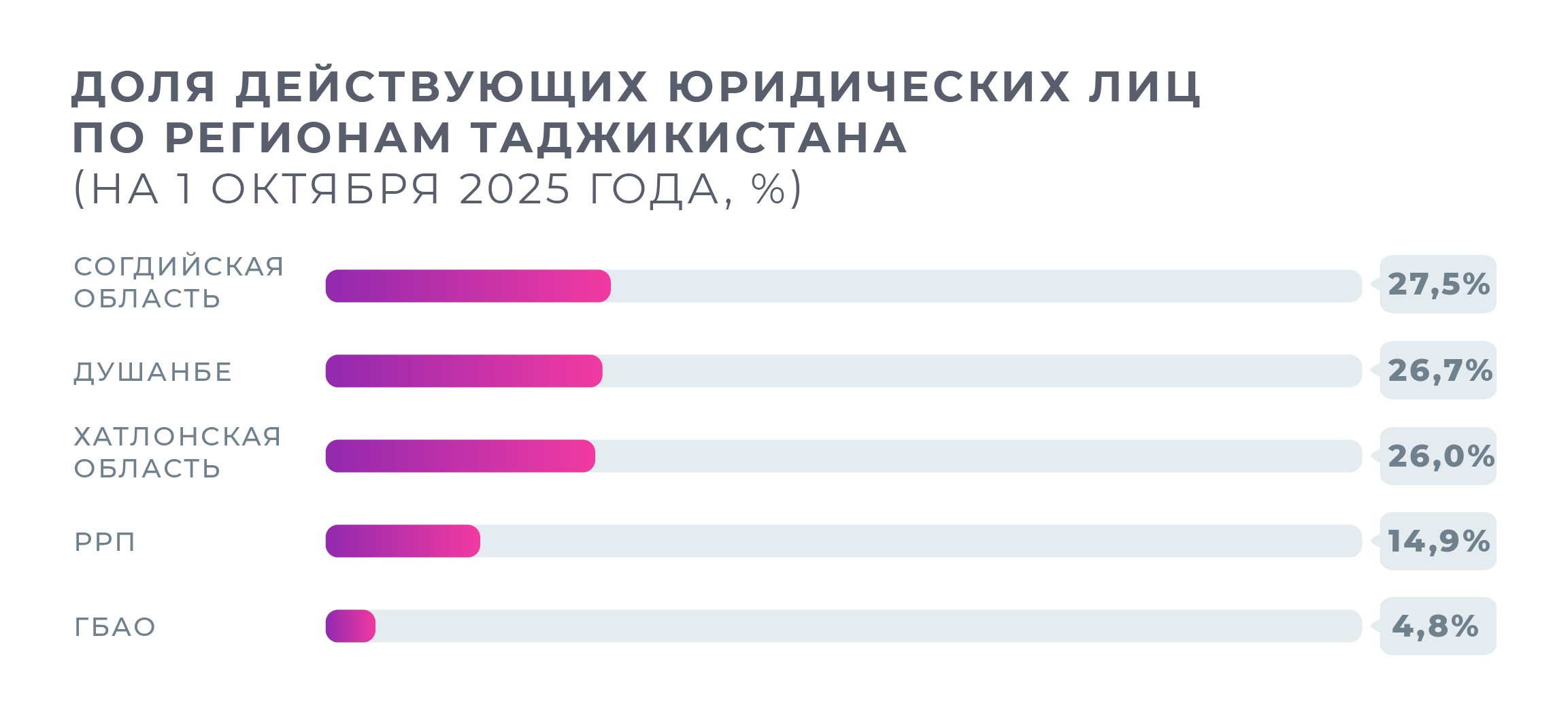В региональном разрезе предпринимательская активность распределяется неравномерно: наибольшая доля индивидуальных предпринимателей приходится на Согдийскую и Хатлонскую области, затем следуют районы республиканского подчинения и город Душанбе. Самый низкий показатель отмечается в ГБАО.