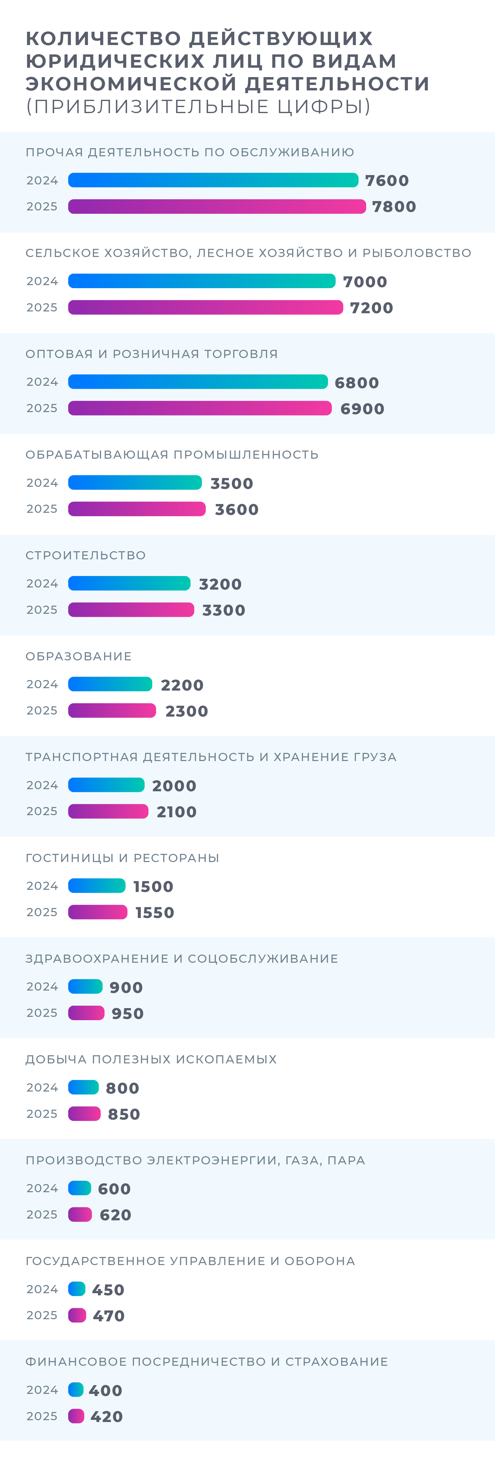 В экономике по-прежнему доминируют торговля, строительство, обрабатывающая промышленность и сельское хозяйство, что подтверждается распределением действующих юридических лиц по видам экономической деятельности.